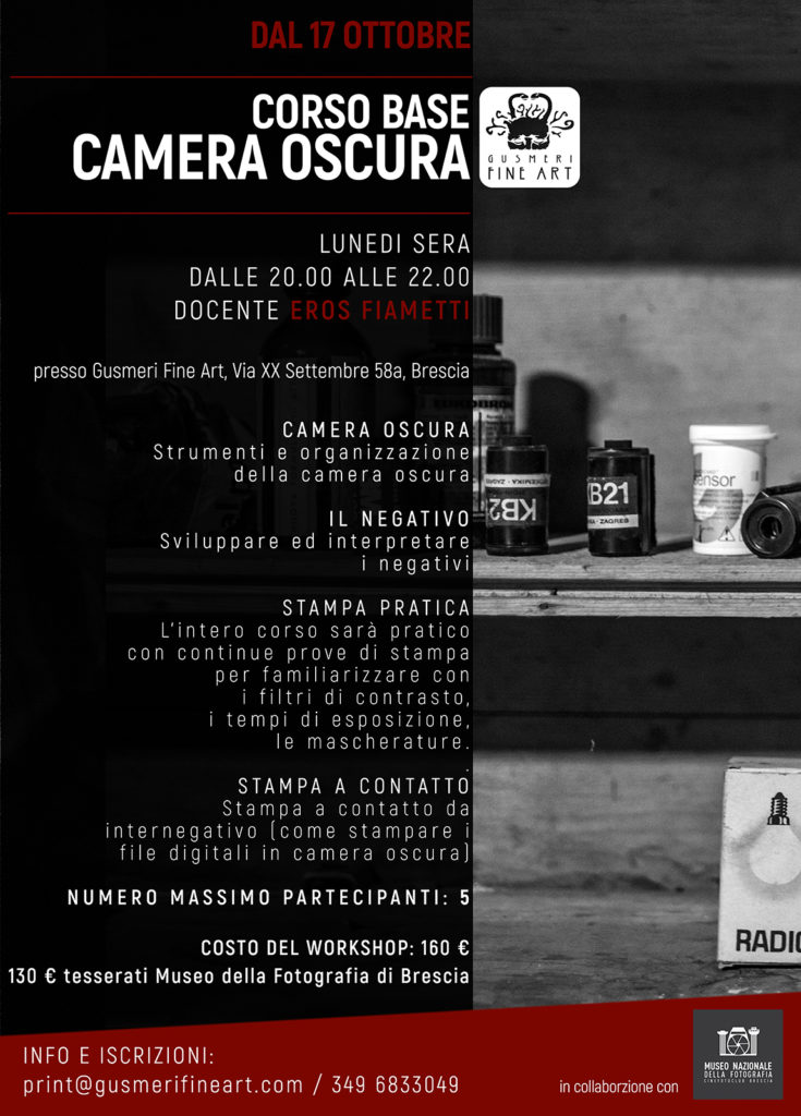 Il corso base di stampa ai sali d’argento in camera oscura è organizzato in collaborazione con il Museo Nazionale della Fotografia di Brescia e il fotografo-stampatore Eros Fiammetti.